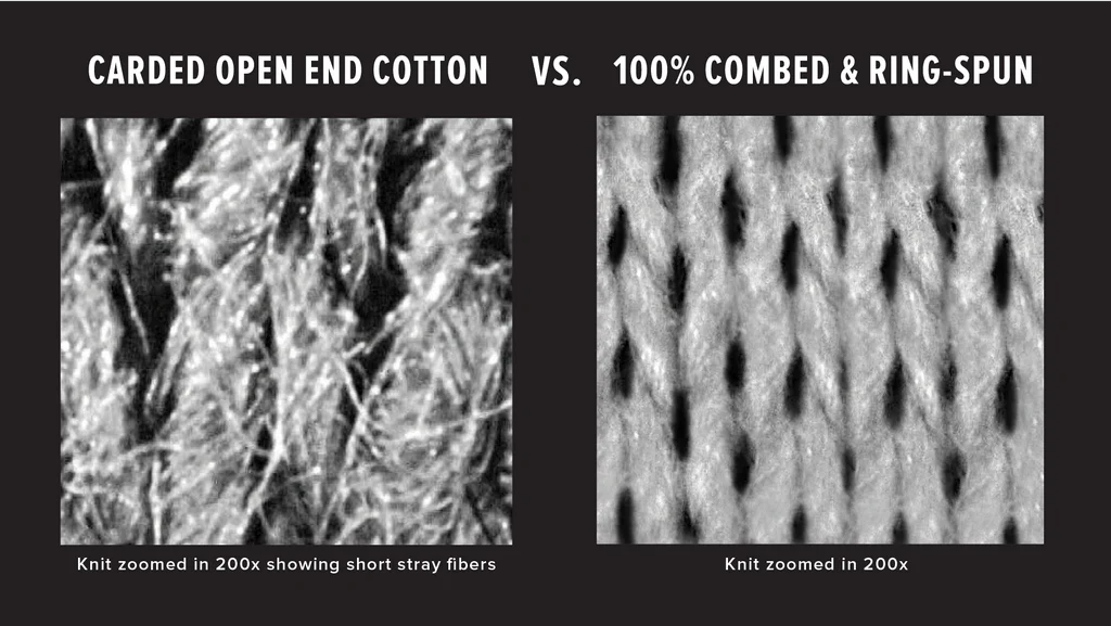 Carded Open-End is the cheapest way to spin cotton but it leaves a rough texture making both the feel and the print quality worse. This method tends to lose its shape quicker in the wash.
